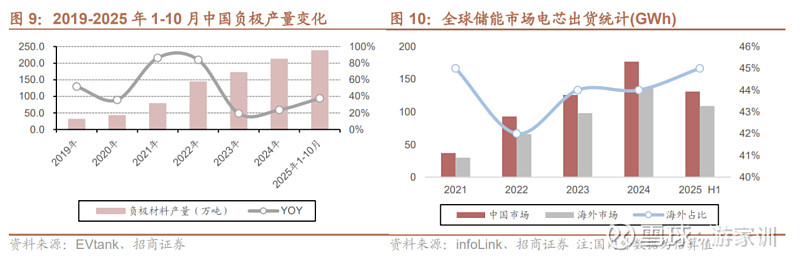 储能或拉动负极需求高增。2024年中国负极出货量达211.5万吨,同比增长24%,占全球总出货量超95%。2025年1-10月,中国负极材料出货238万吨,同比增长38%。储能是电池端核心增长动力,受益于国内政策驱动转收益驱动、海外美国大储及各场景涌现,2025H1,全球储能电芯出货 240GWh(同比+106%),预计26年需求持续旺盛。受益于下游储能的快速增长,预计2026年负极需求有望维持高增速。