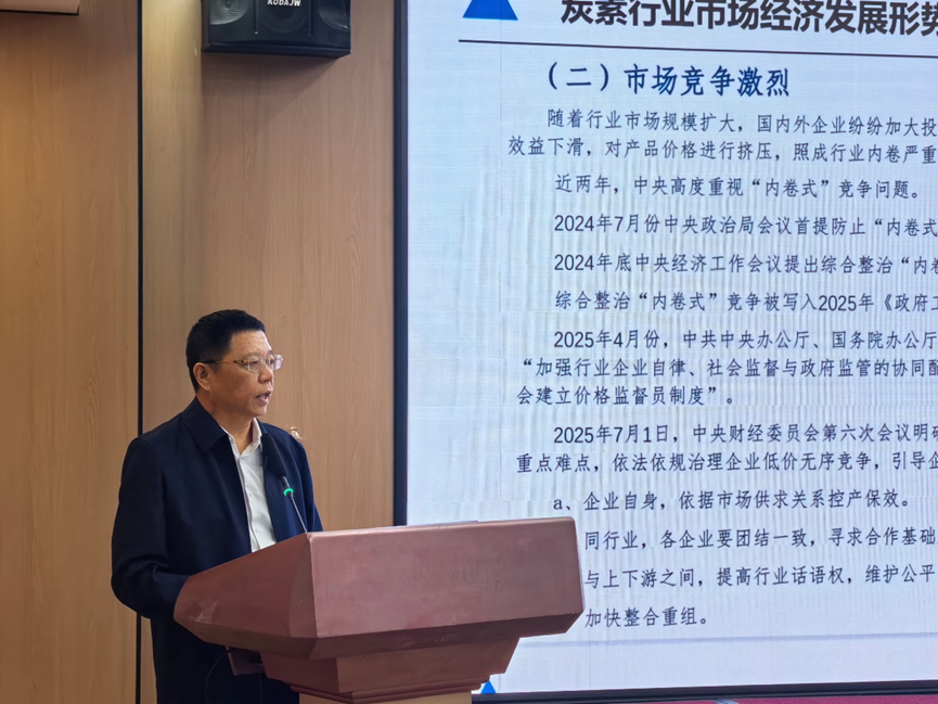 图为付强作题为《炭素行业经济运行分析及发展趋势》的报告