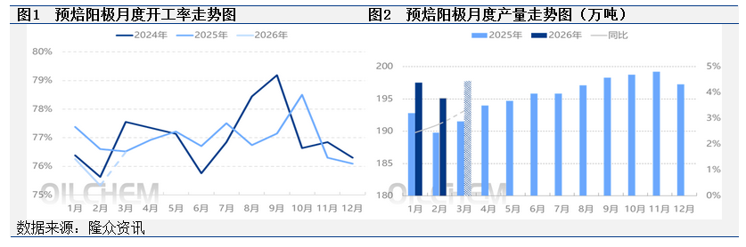 3月份来看,随采暖季结束,预焙阳极生产企业开工逐步提升,预计月度开工率达到76.5%左右,较去年同期基本持平。另外各地新投项目进展顺利,产量继续释放,预焙阳极整体供应表现预期良好,预计月度产量提升至198万吨左右,同比增幅约3.3%。